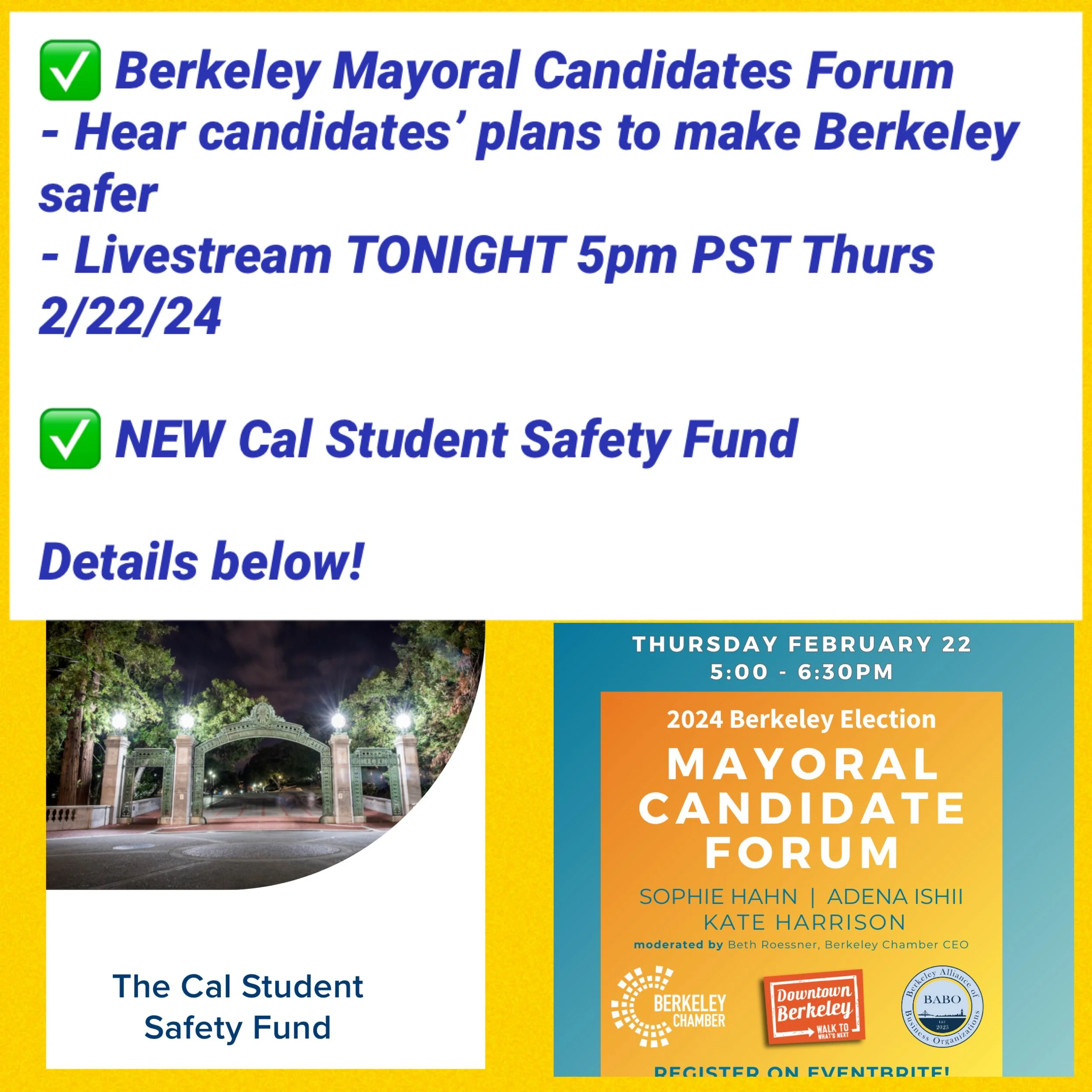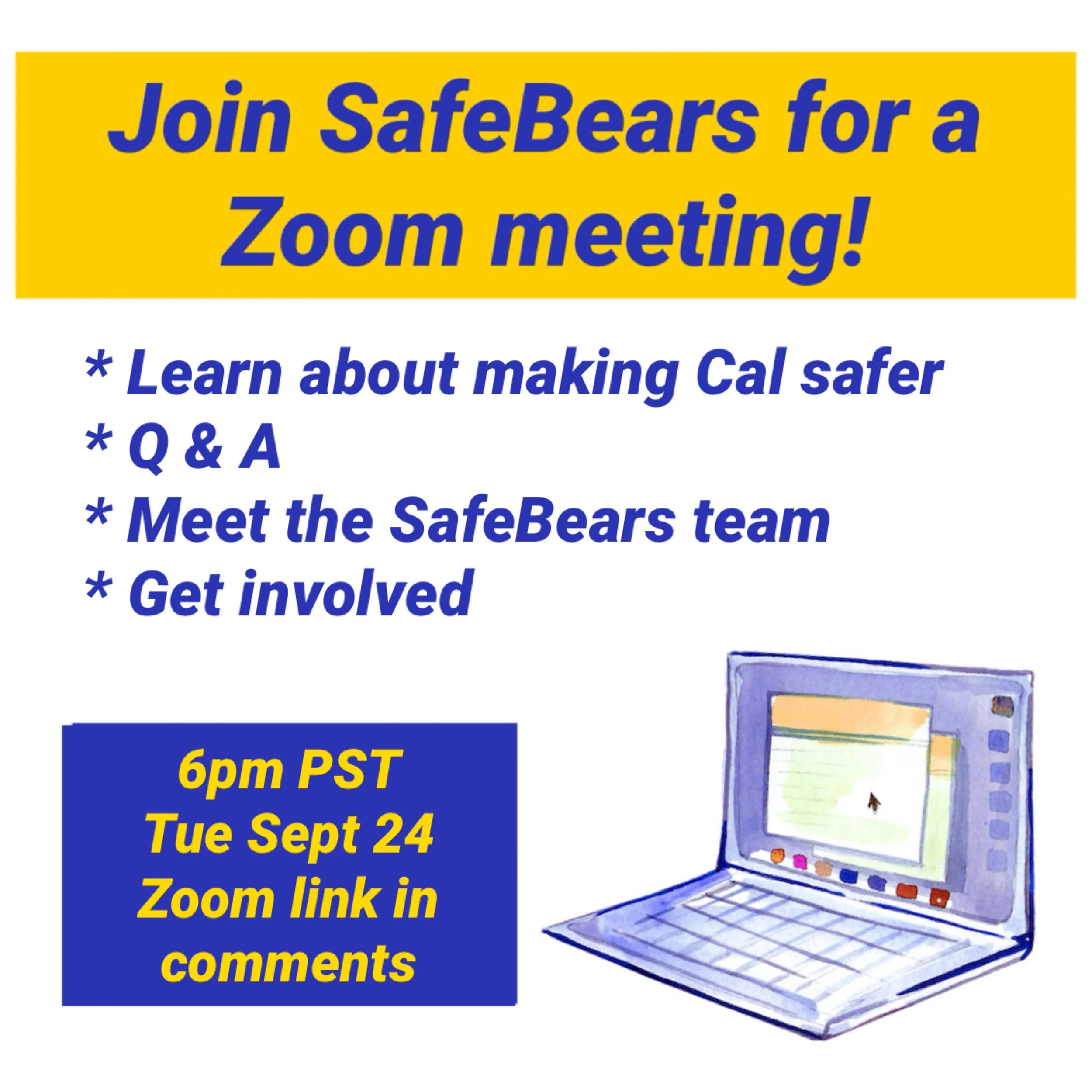 Join us for an important update as we share all the exciting projects we’re working on to make Cal students safe! Short presentation followed by Q&A, so bring your questions!