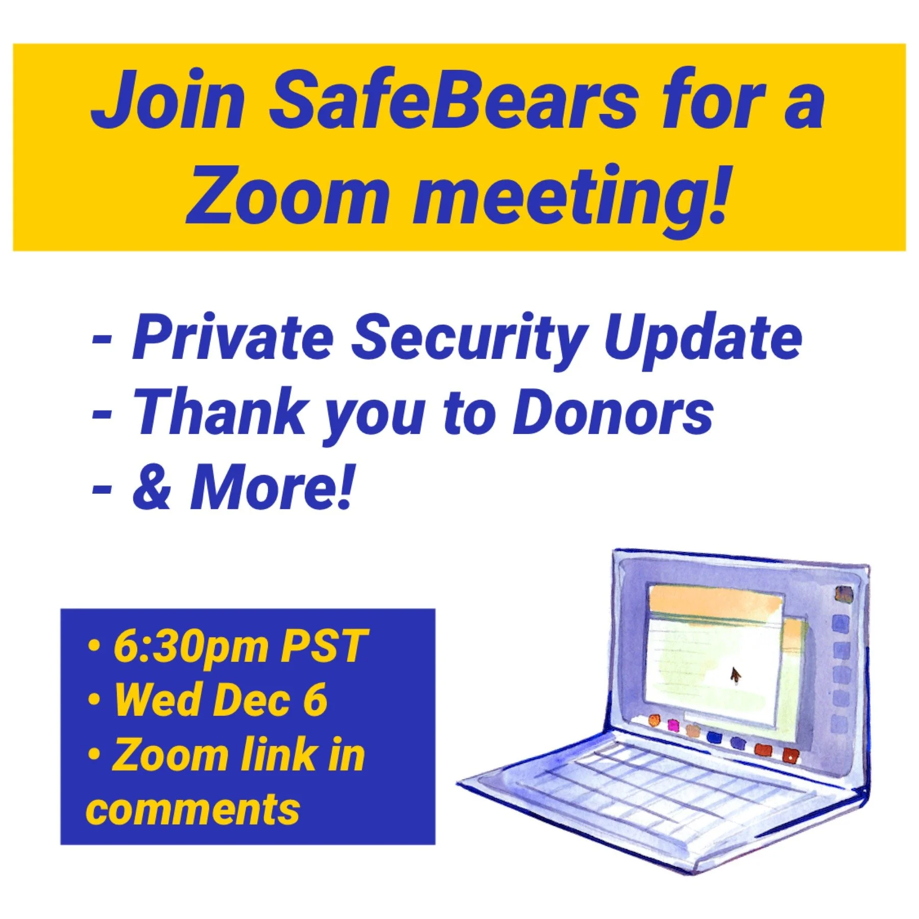 Zoom meeting: private security update, thank you to our donors & more!