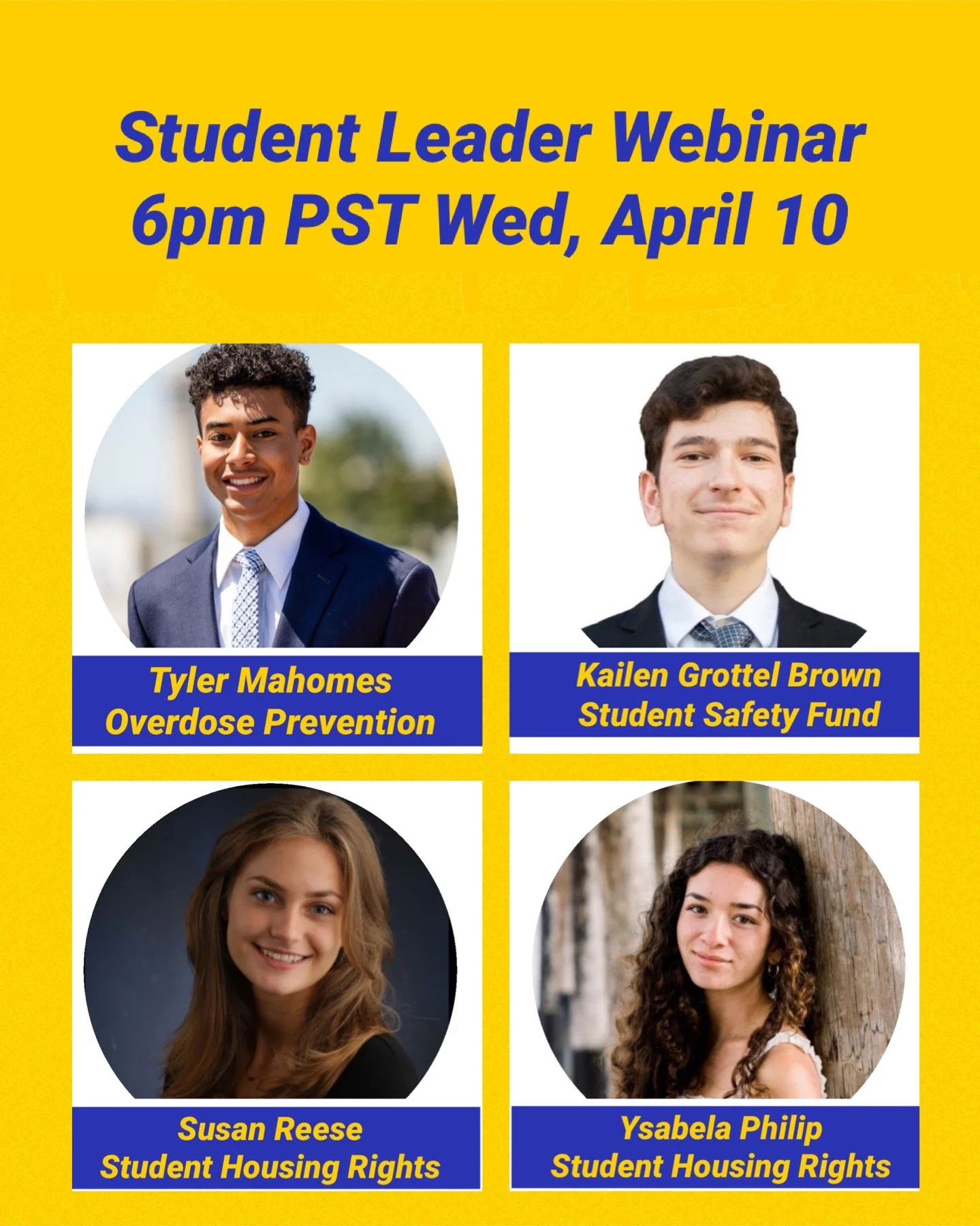 Join SafeBears via Zoom for a webinar with 4 outstanding student leaders who will discuss overdose prevention, housing rights, and ASUC safety initiatives including lighting and the Cal Student Safety Fund.