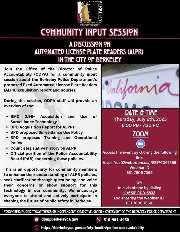 The Berkeley Police Accountability Board (PAB) wants to know if people want License Plate Readers in the city of Berkeley. The PAB has historically opposed these tools on the grounds that they represent an overreach by the police department, and we expect a lot of folks will speak against LPRs during the session.