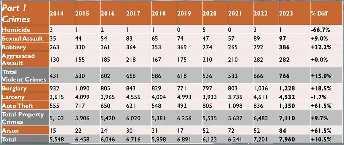 Property crime was up about 10%, with burglary, auto theft and arson all increasing.