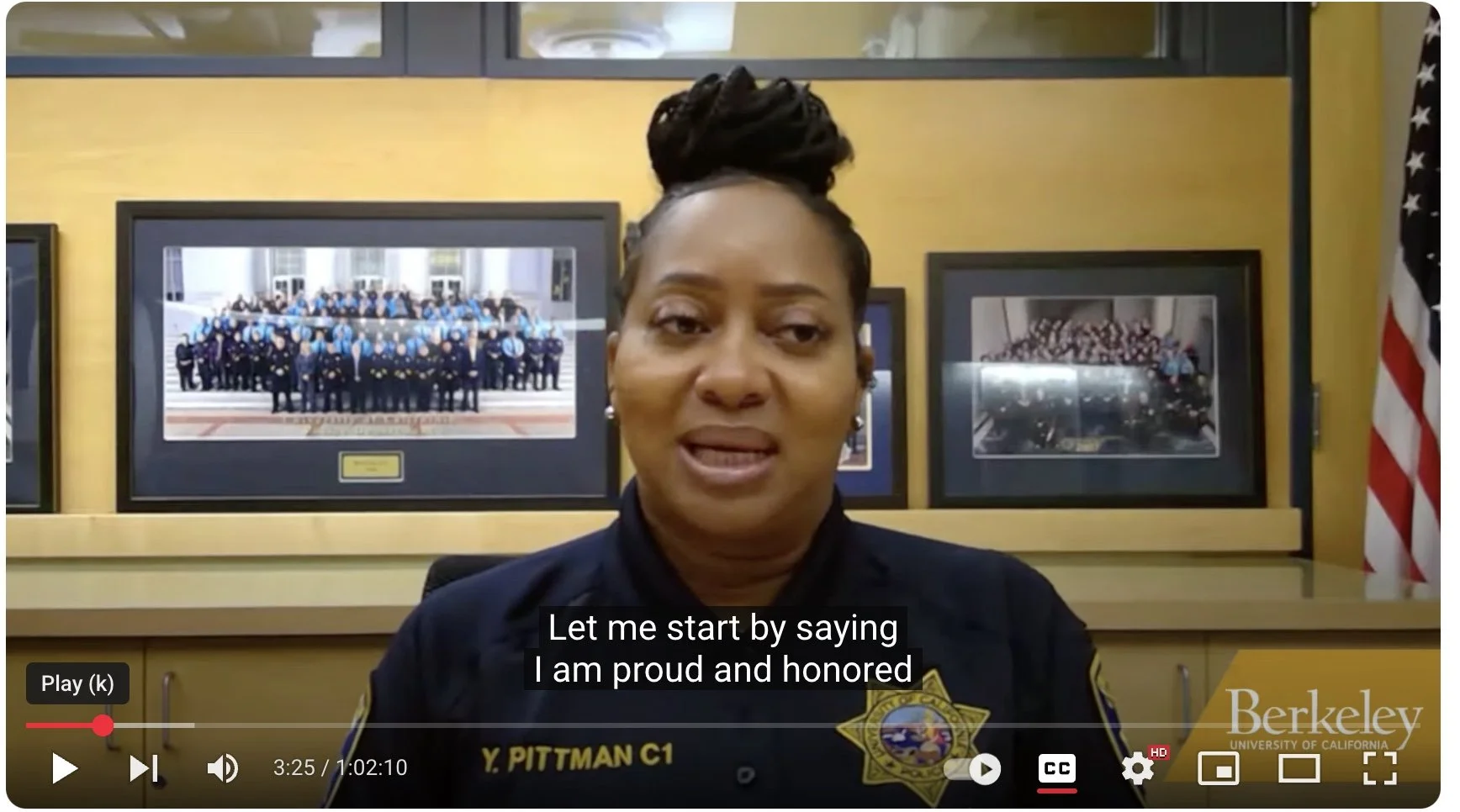 UC Berkeley Chief of Police Yogananda Pittman discusses campus safety in a Sept 2023 Campus Conversation (available on YouTube)