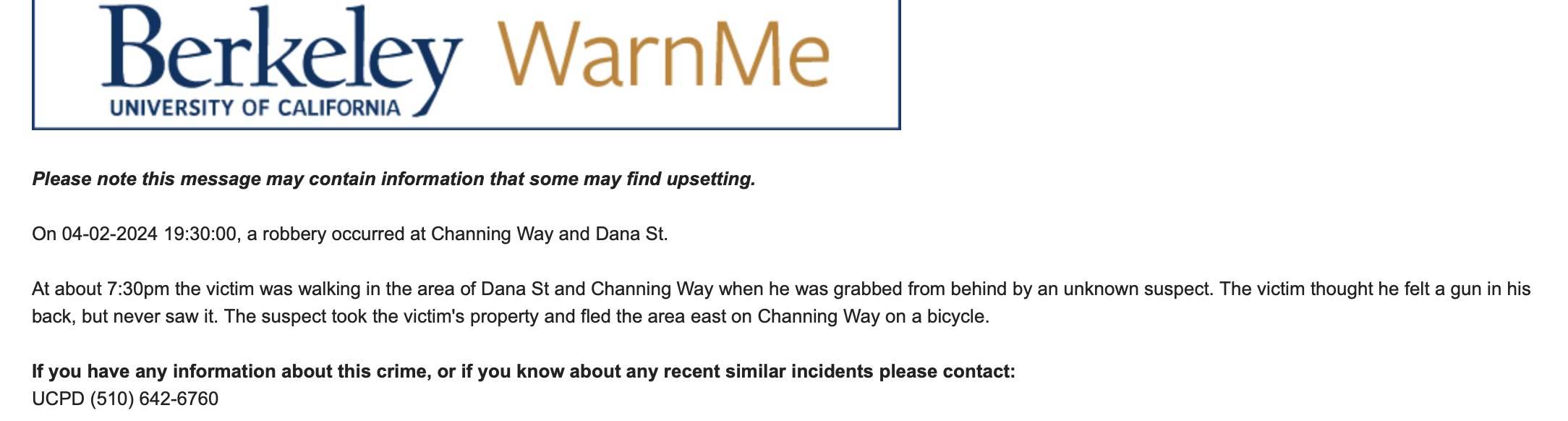 WarnMe: Pedestrian robbery in Southside May 18 Written By Victoria Cole On April 2, 2024, at 7:30pm, a pedestrian was robbed in the neighborhood south of campus. Victoria Cole